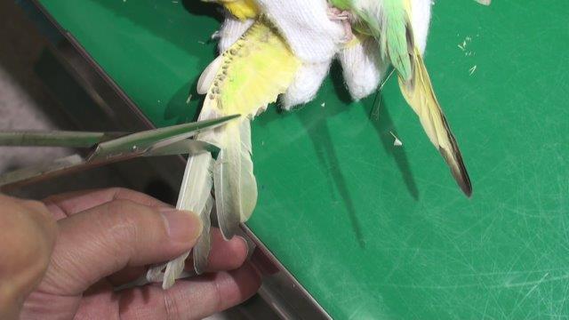 風切羽といわれる外側の羽を残すように切ります。1枚だけだと強度が確保できないので2〜3枚残して内側をはさみで切ります。このようにすると外側の羽は残っているので見た目のがよくなります。また羽の羽軸から内側だけをそいで半分にするやり方もありますが。鳥が暴れることを考えると短時間で済む方法が負担が少ないでしょう。切る場合には成長中の羽がないか確認してから切ります。