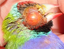 オウムは、ビタミン欠乏が原因で目の周り腫れ開発する唯一の鳥ではありません。このフィンチは、貧しい食事が原因でおおきな眼窩周囲膿瘍になっています。
