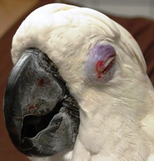 タイハクオウムは頭部外傷で目の周りの腫れを起こしている。