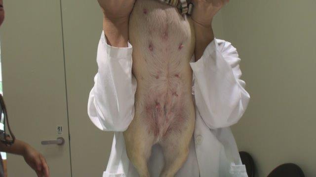 皮膚の化膿性炎症を総称して膿皮症と呼ぶ。軽度なものでは自然治癒するが、感染抵抗性の弱い犬や、本性に対する治療法が不適切だったりすると炎症が悪化し、慢性化しやすい。 化膿部の深さや程度、化膿の原因となる細菌種類、基礎疾患の有無などにより病名が違ってくる おなか全体に赤い湿疹ができている。