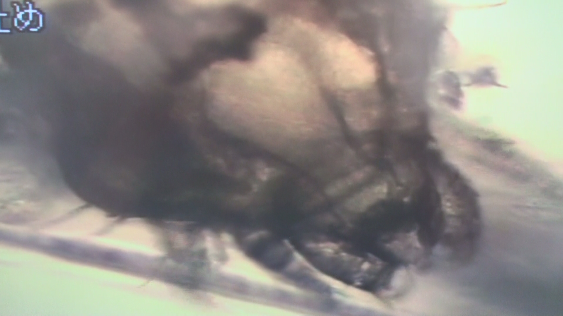 患部の落屑、被毛から採材したセロファンテープから、鏡検で虫体を確認する。